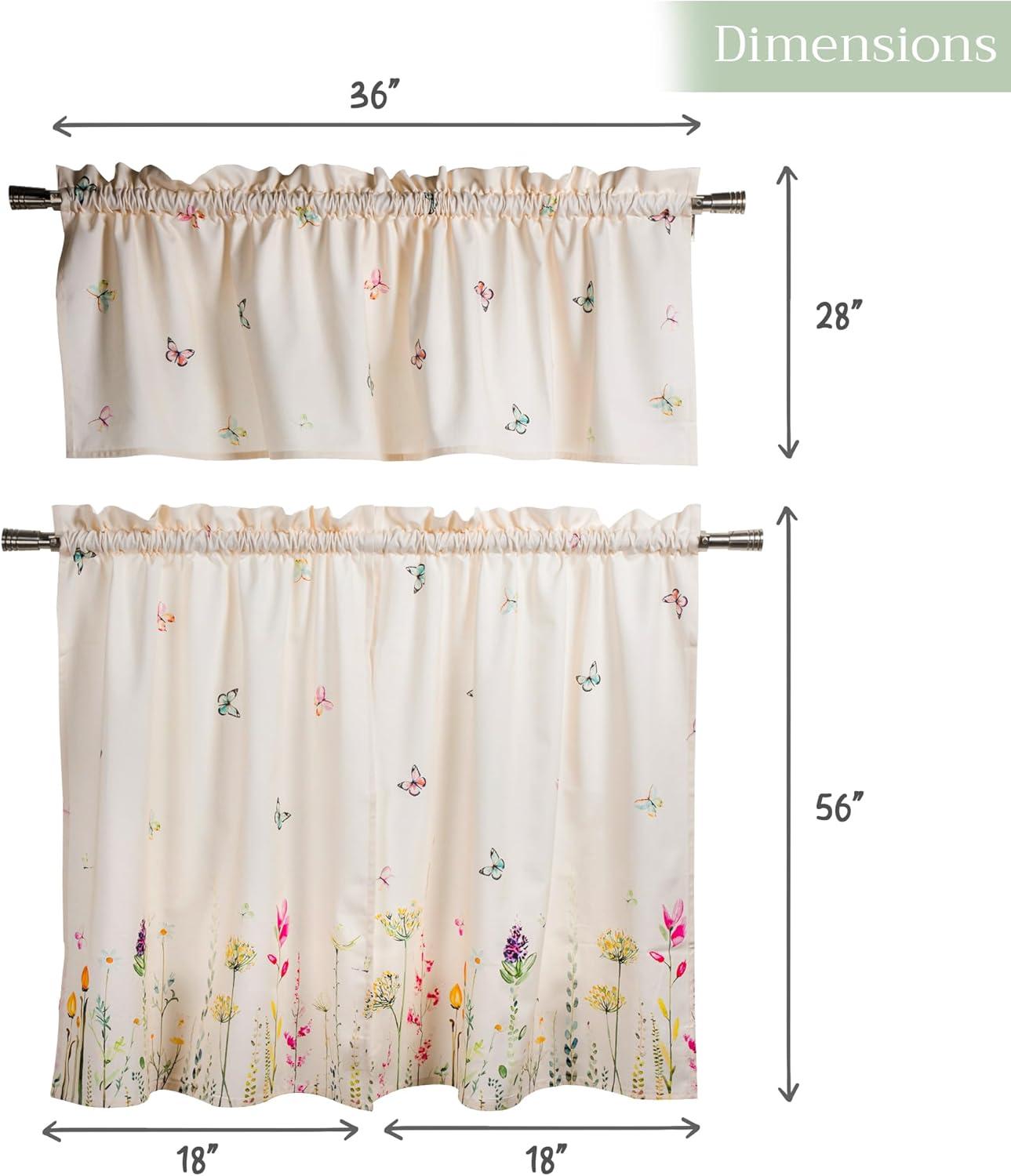 Set includes: 2 tier curtains (28 x 36 inches each) and 1 matching valance (56 x 18 inches). This elegant kitchen curtain set adds both charm and privacy to your space. Designed in Europe and Made in India, it offers a perfect balance of function and style