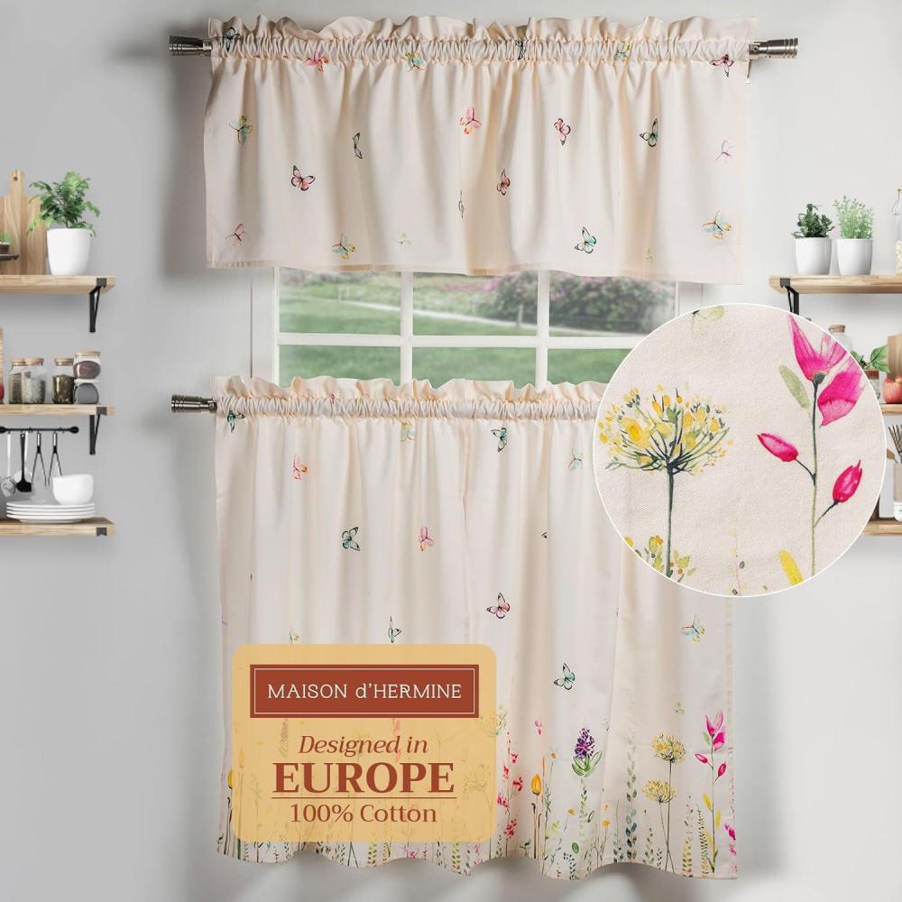 Maison d’ Hermine Kitchen Curtains Sets for Windows 100% Cotton Set of Kitchen Curtains Valances for Home [2 Tiers (28″X36″) and 1 Valance (56″X18″)] Farmhouse, Cafe (Dalida)(01 – Fleurs De Mai)