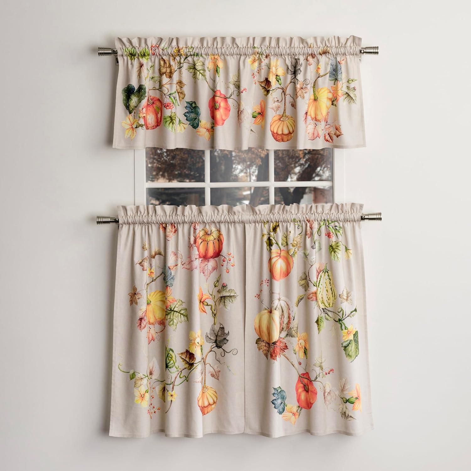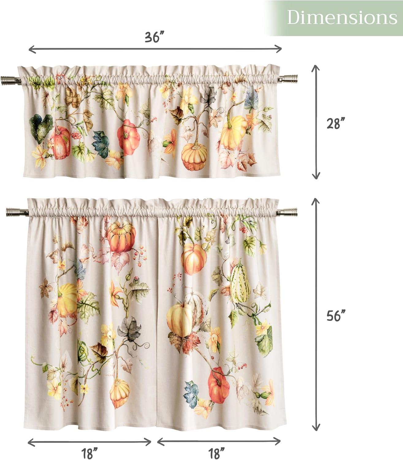 Set includes: 2 tier curtains (28 x 36 inches each) and 1 matching valance (56 x 18 inches). This elegant kitchen curtain set adds both charm and privacy to your space. Designed in Europe and Made in India, it offers a perfect balance of function and style
