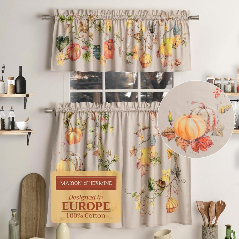 Maison d’ Hermine Kitchen Curtains Sets for Windows 100% Cotton Set of Kitchen Curtains Valances for Home [2 Tiers (28″X36″) and 1 Valance (56″X18″)] Farmhouse, Cafe (Dalida)(19 – Potiron)