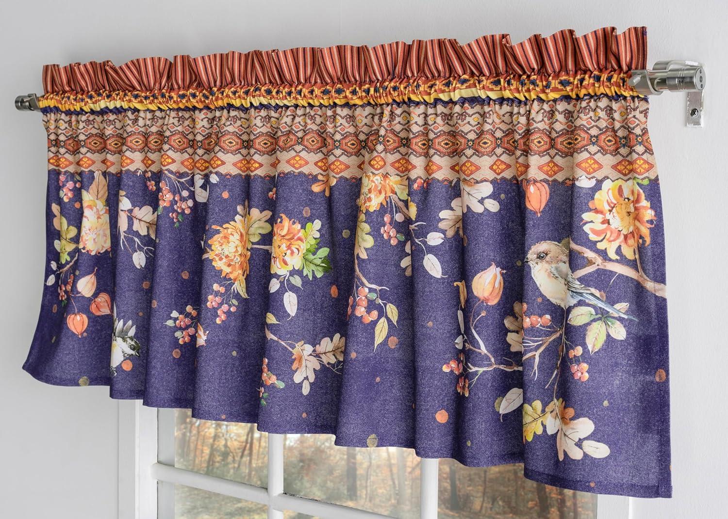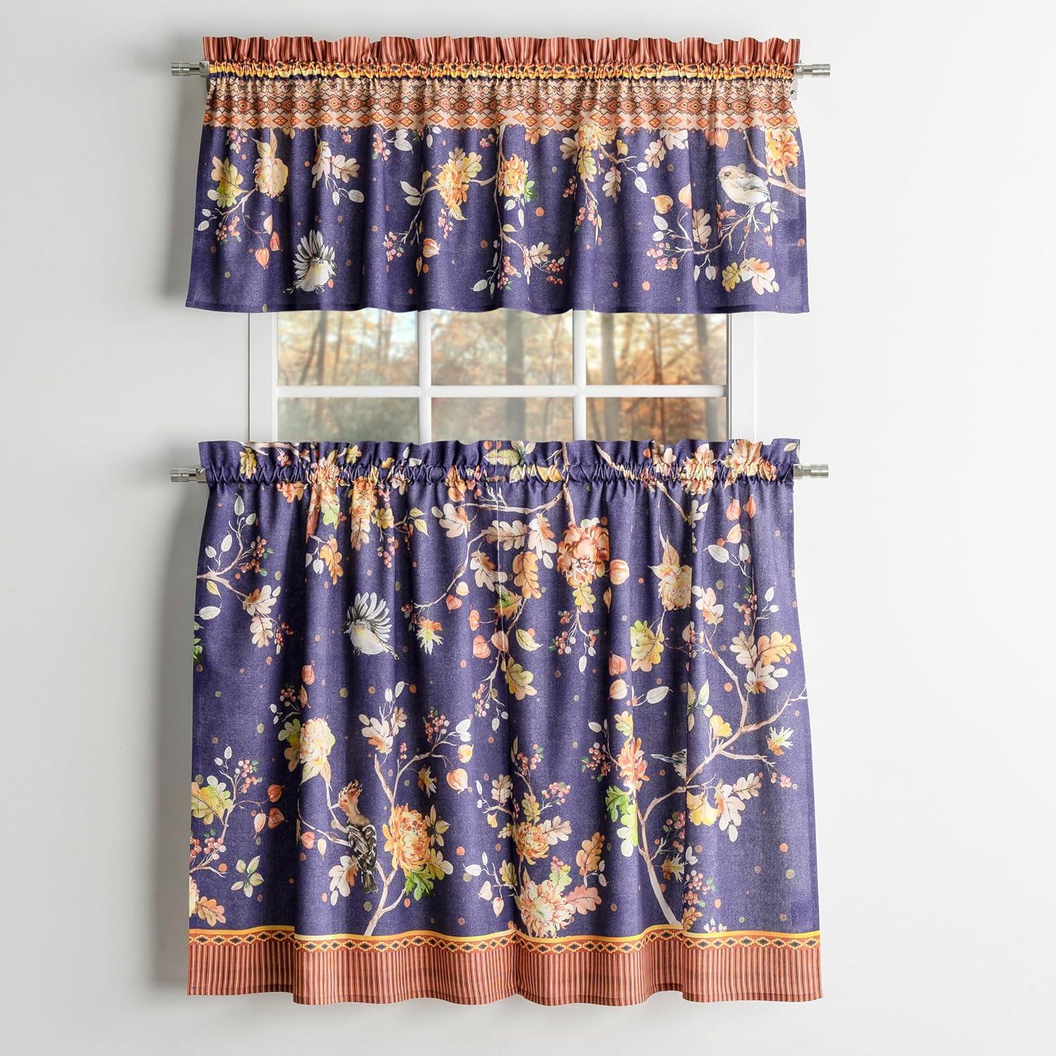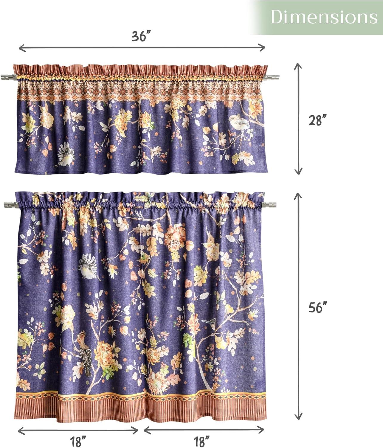 Set includes: 2 tier curtains (28 x 36 inches each) and 1 matching valance (56 x 18 inches). This elegant kitchen curtain set adds both charm and privacy to your space. Designed in Europe and Made in India, it offers a perfect balance of function and style