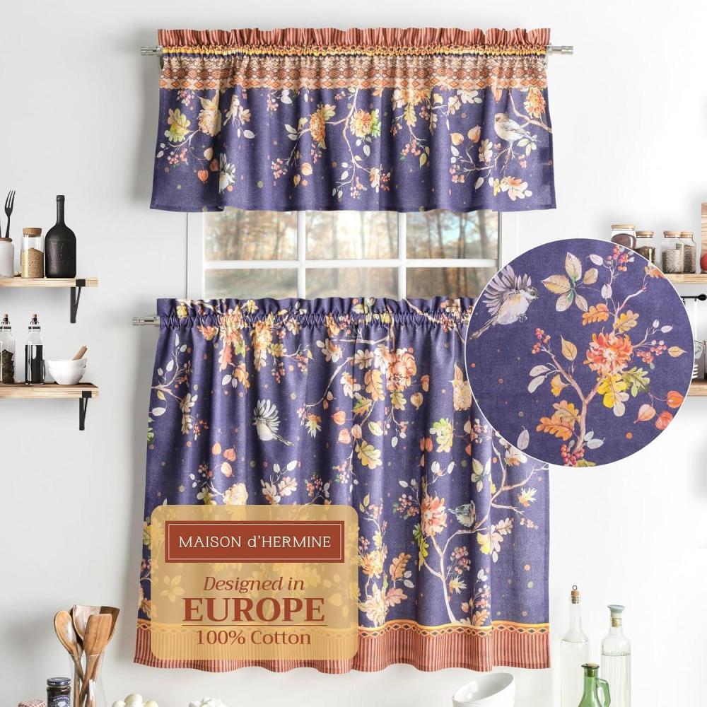 Maison d’ Hermine Kitchen Curtains Sets for Windows 100% Cotton Set of Kitchen Curtains Valances for Home [2 Tiers (28″X36″) and 1 Valance (56″X18″)] Farmhouse, Cafe (Dalida)(21 – Dalida)