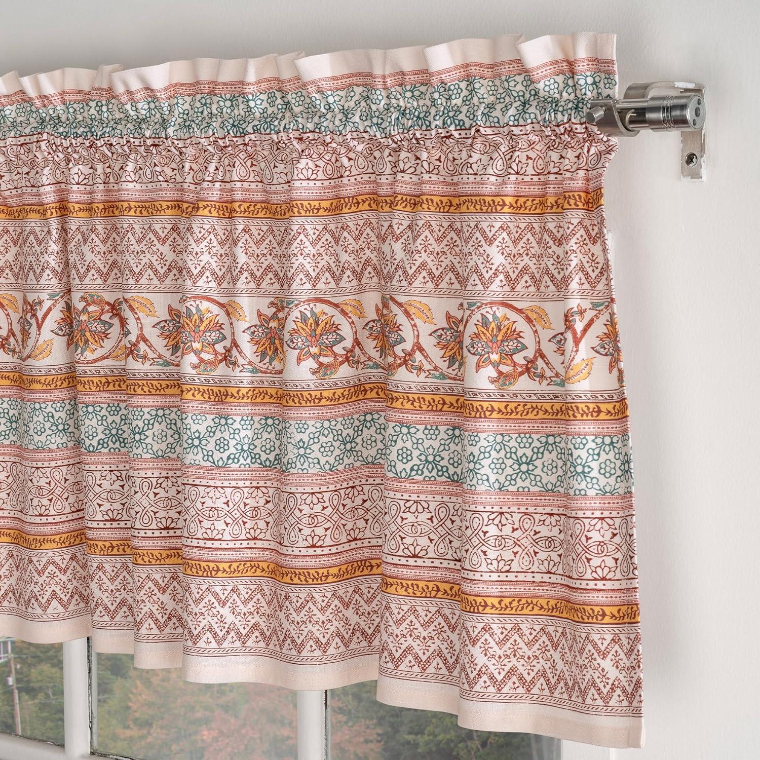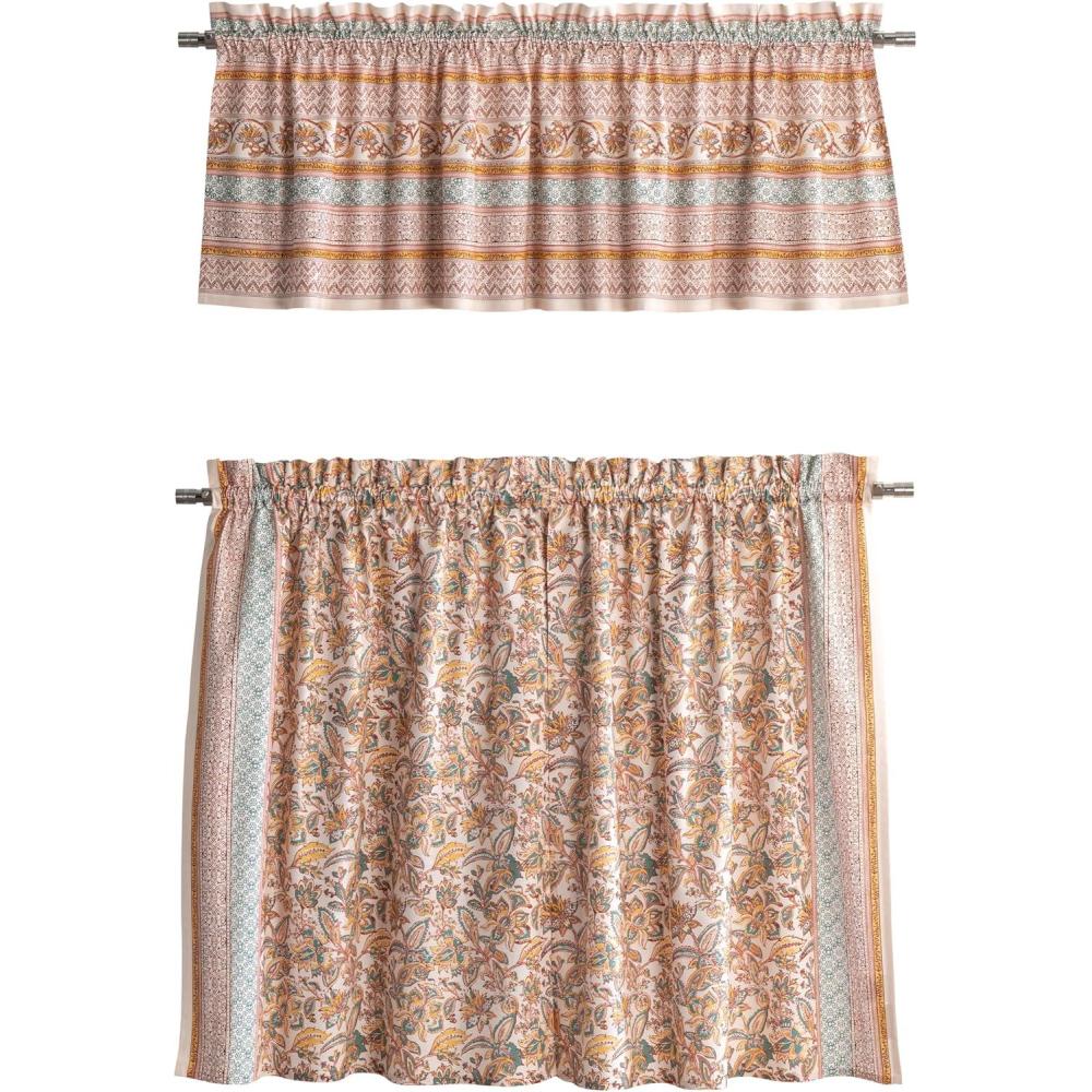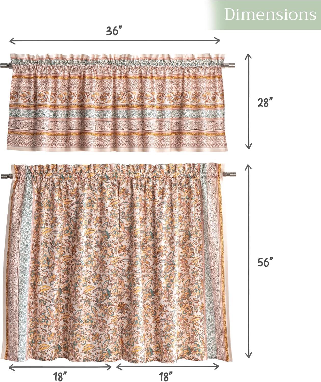 Set includes: 2 tier curtains (28 x 36 inches each) and 1 matching valance (56 x 18 inches). This elegant kitchen curtain set adds both charm and privacy to your space. Designed in Europe and Made in India, it offers a perfect balance of function and style