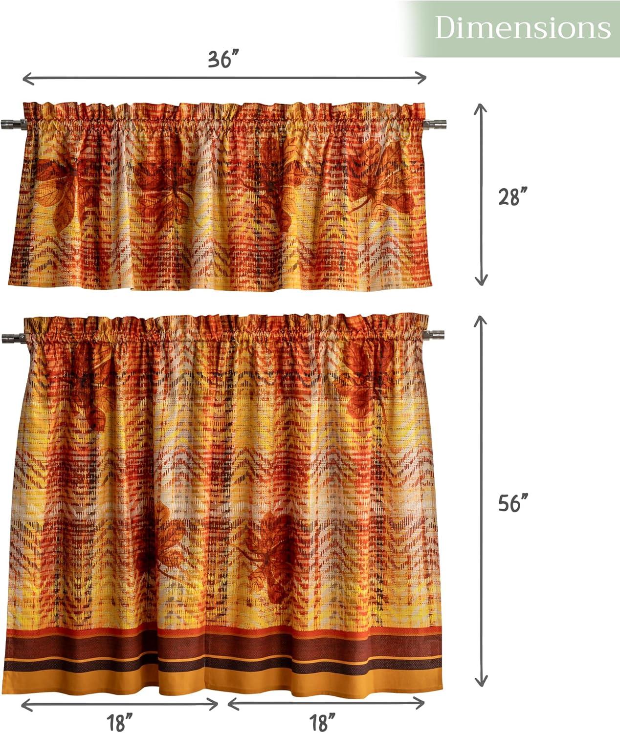 Set includes: 2 tier curtains (28 x 36 inches each) and 1 matching valance (56 x 18 inches). This elegant kitchen curtain set adds both charm and privacy to your space. Designed in Europe and Made in India, it offers a perfect balance of function and style