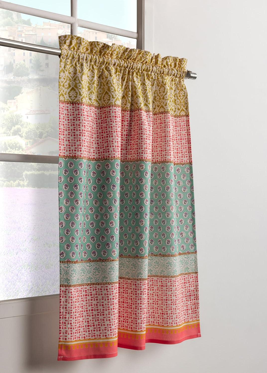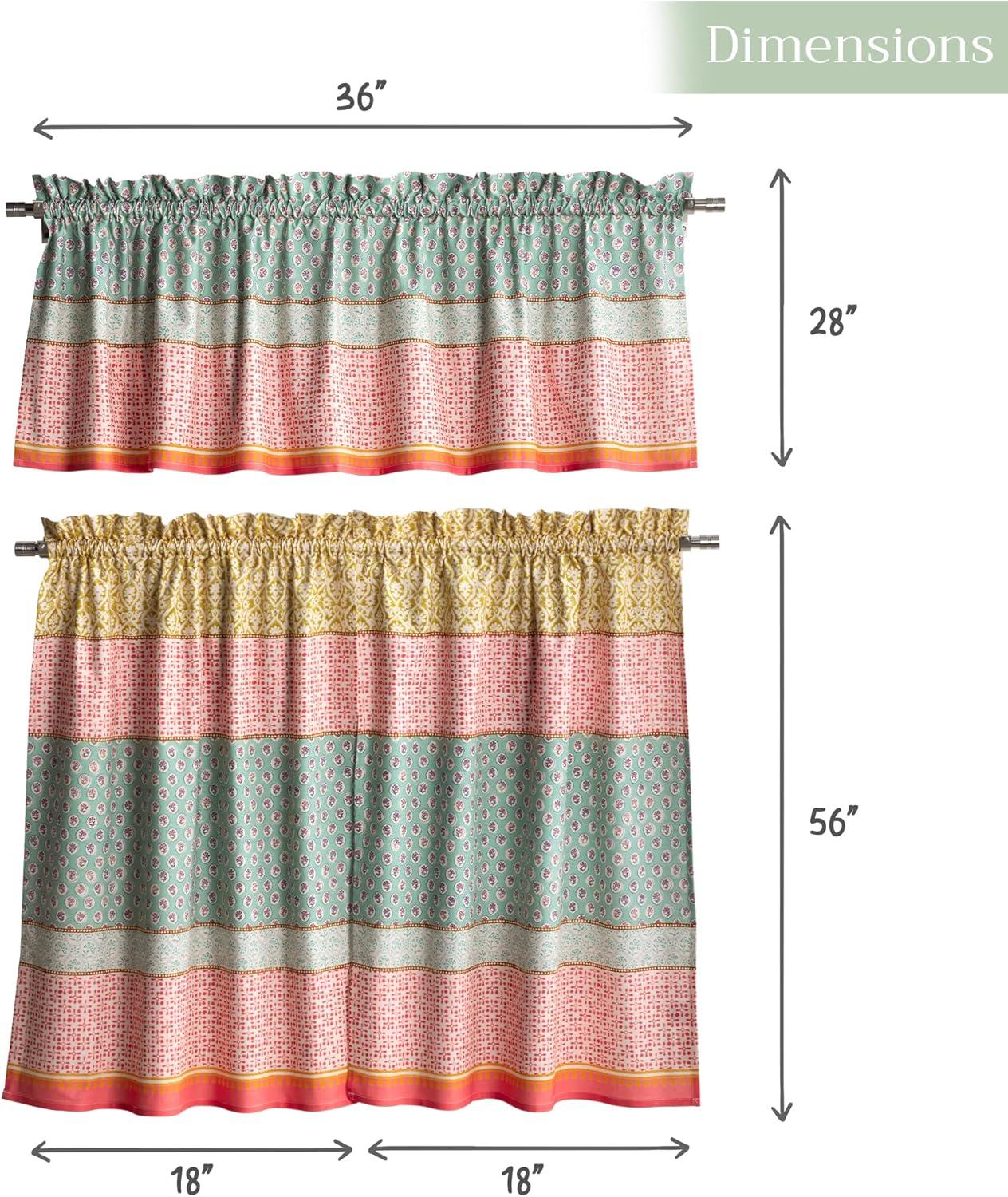 Set includes: 2 tier curtains (28 x 36 inches each) and 1 matching valance (56 x 18 inches). This elegant kitchen curtain set adds both charm and privacy to your space. Designed in Europe and Made in India, it offers a perfect balance of function and style