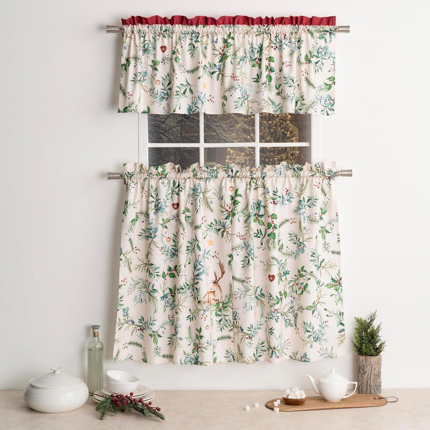 Maison d' Hermine Kitchen Curtains Sets for Windows 100% Cotton Set of Kitchen Curtains Valances for Home [2 Tiers (28"X36") and 1 Valance (56"X18")] Farmhouse, Cafe (Rural Christmas)(20 - Holly Time)